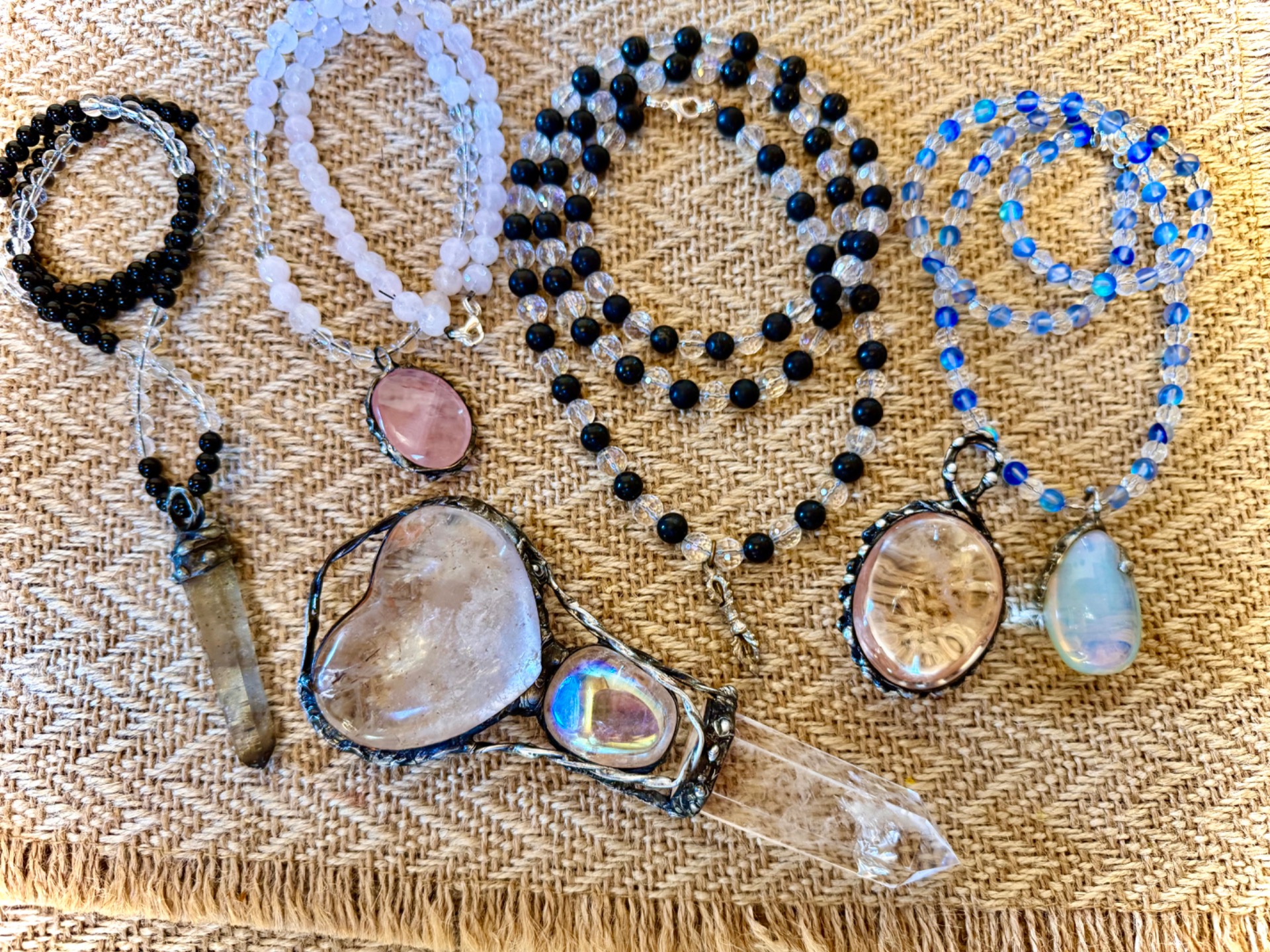Tyto přívěsky tvoříme z vybraných polodrahokamů a krystalů, které uchycujeme do jemných mřížek z barevného kovu. Každá barva, druh krystalizace a typ kamene dodávají amuletu specifickou vibraci. Vložením vašeho osobního záměru se tato přirozená energie krystalu ještě více zpřesní a umocní.