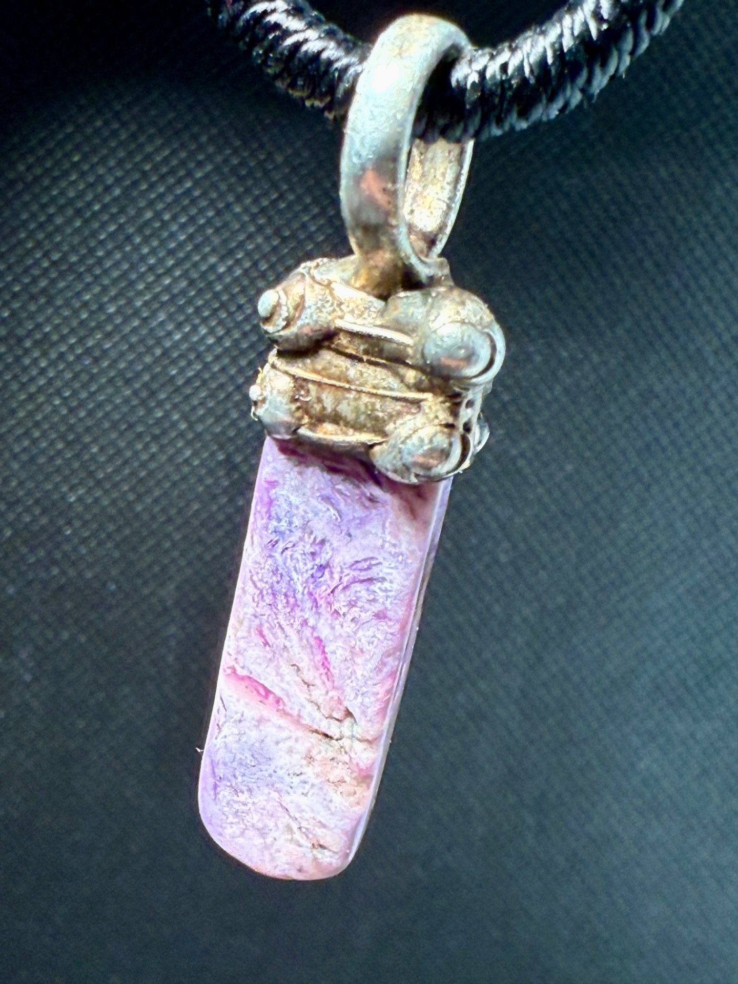 Tento autorský amulet značky MarVitalli zdobí vzácný čaroit, minerál proslulý svou jedinečnou hedvábnou texturou a sytými odstíny fialové, levandulové a černé. Čaroit je kámen "nového věku", který vnáší do života nadhled a pomáhá zvládat velké životní změny s lehkostí.