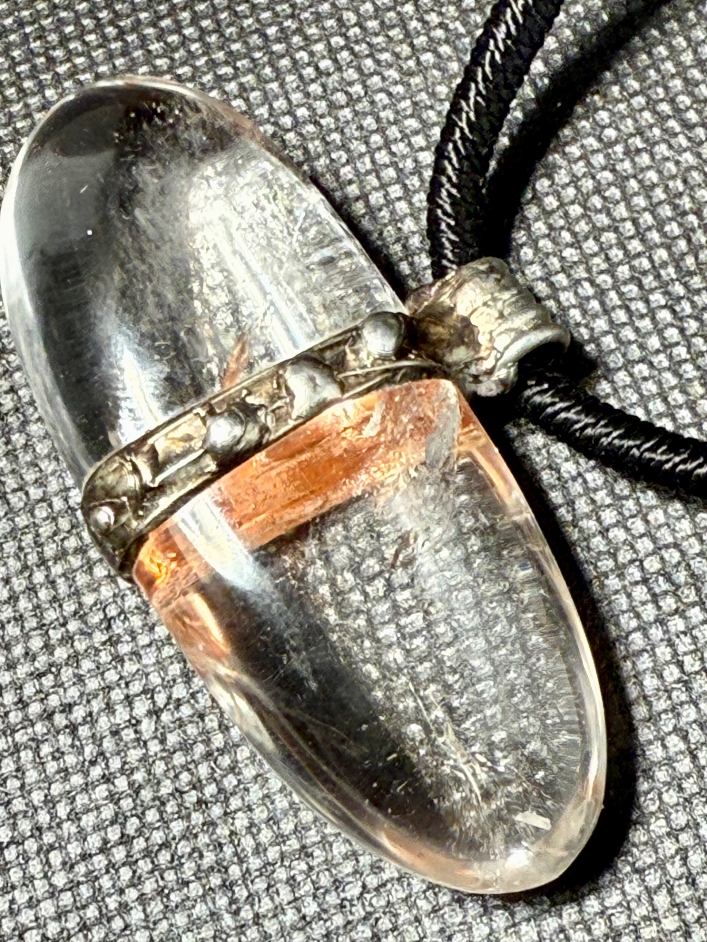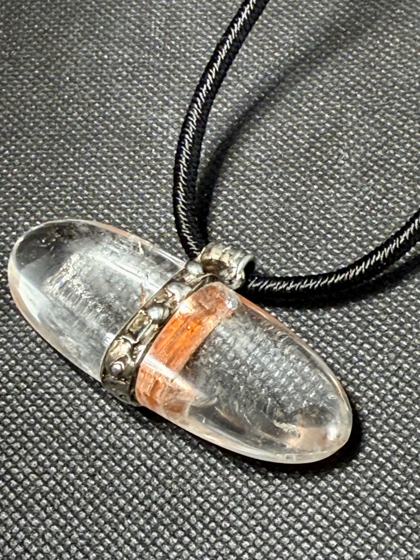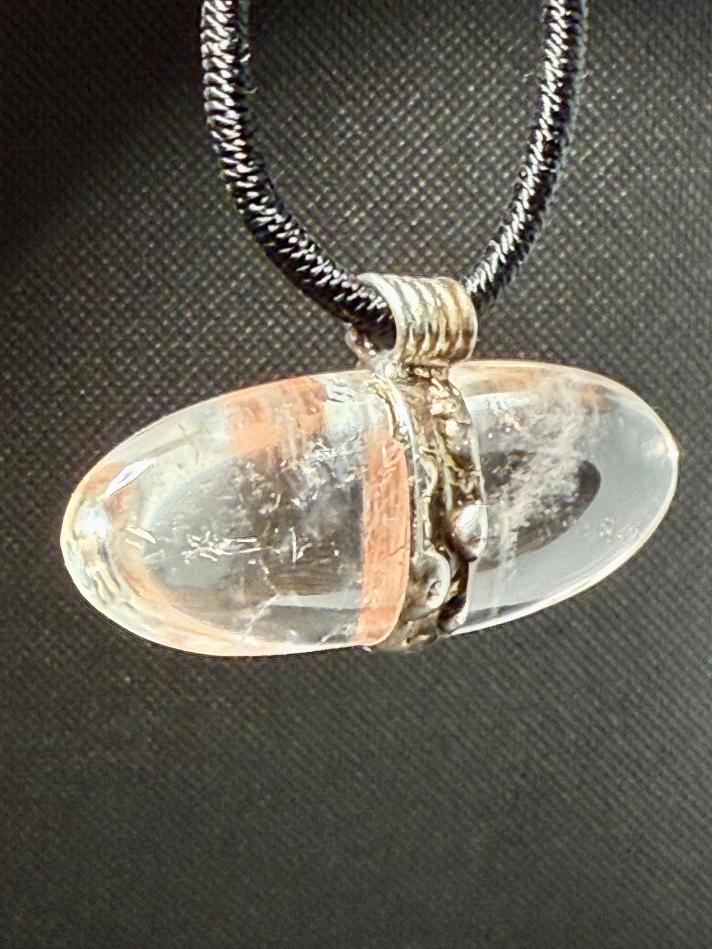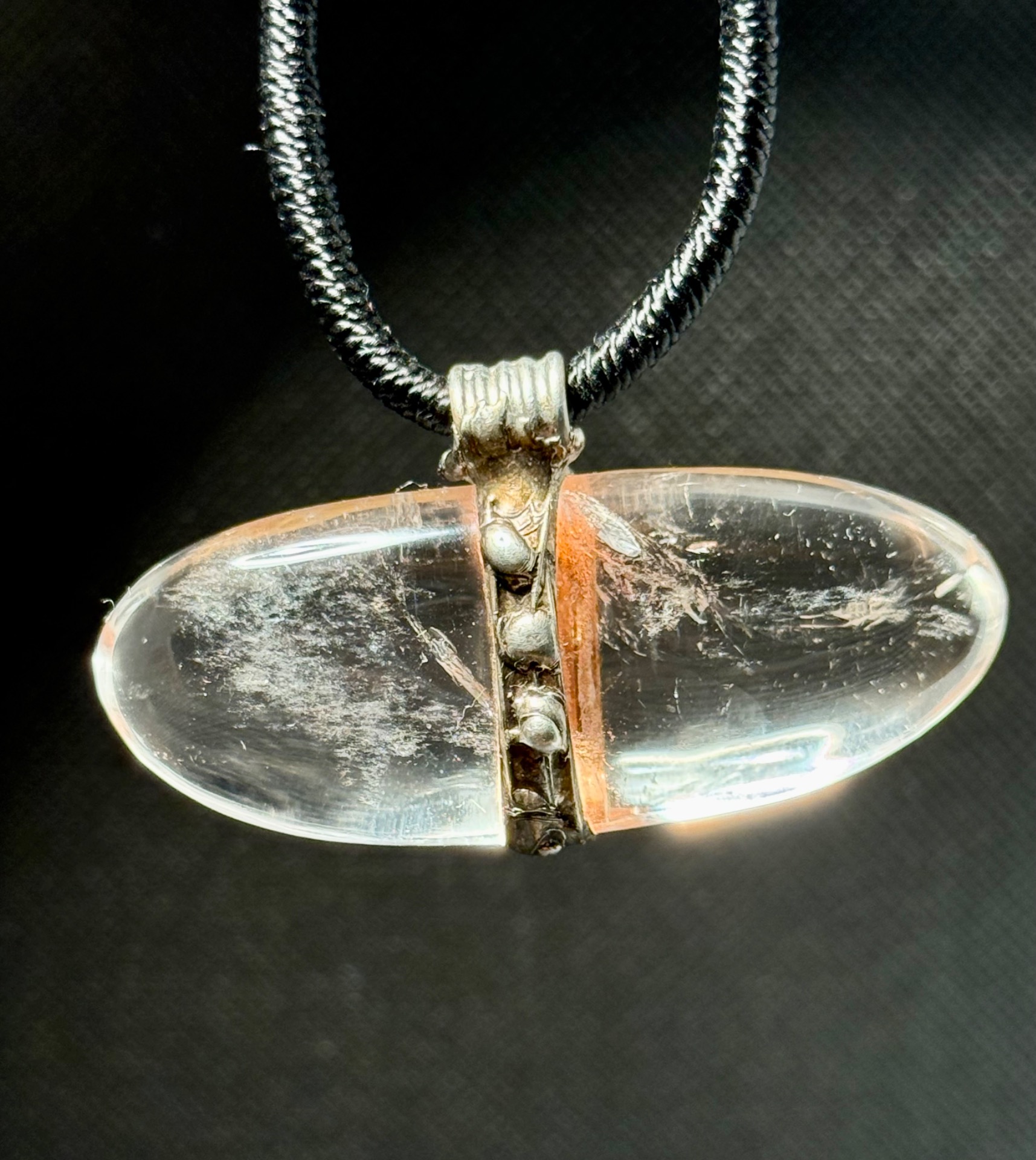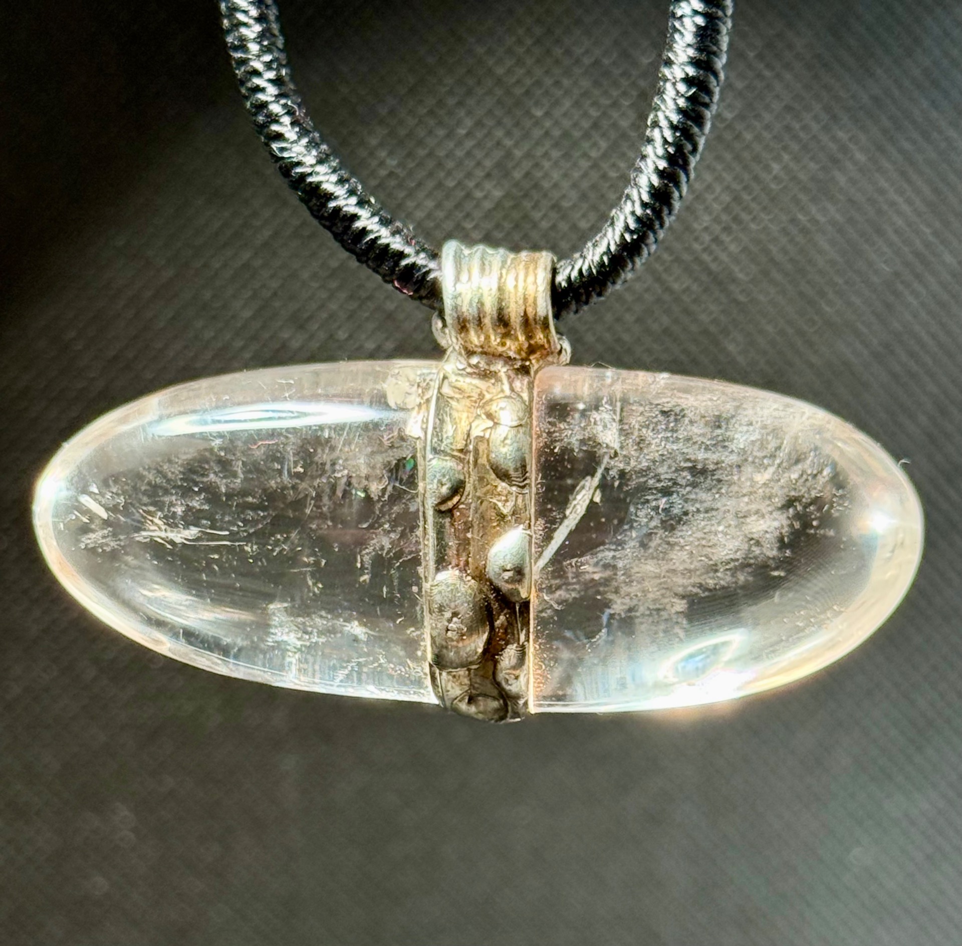 • Kámen: Přírodní čirý křišťál, hladký podélný tvar (ovál).