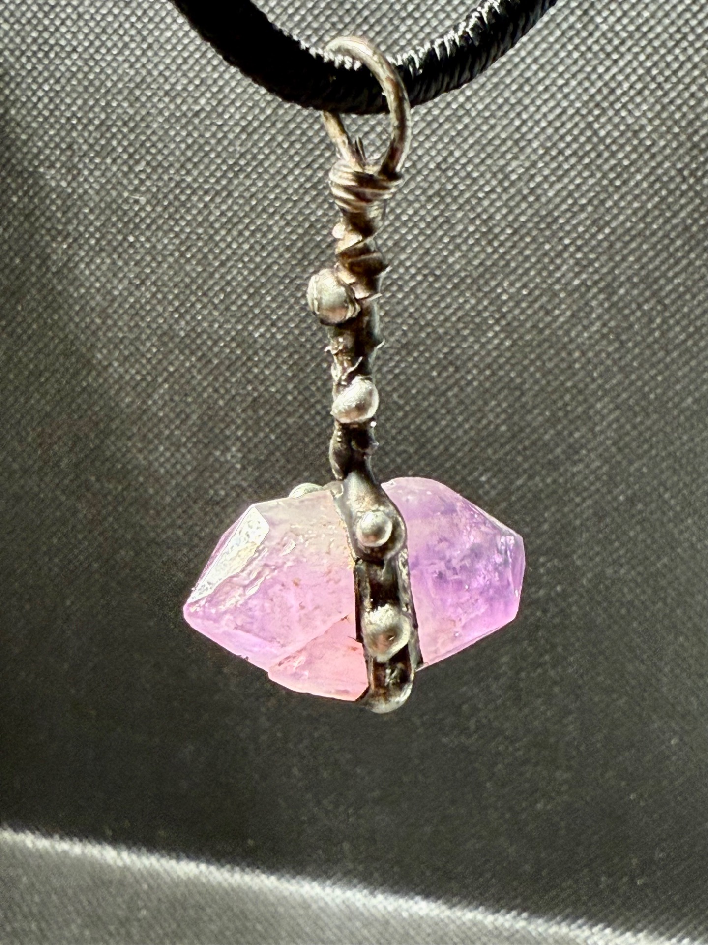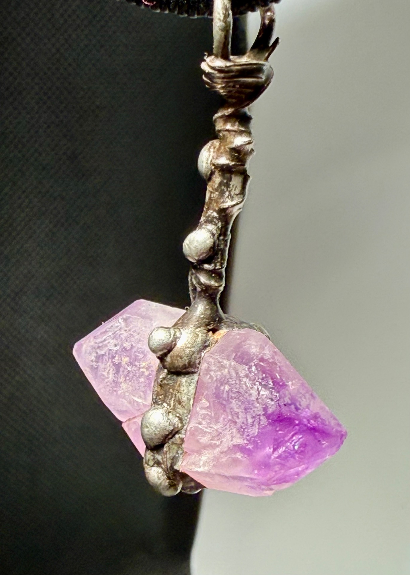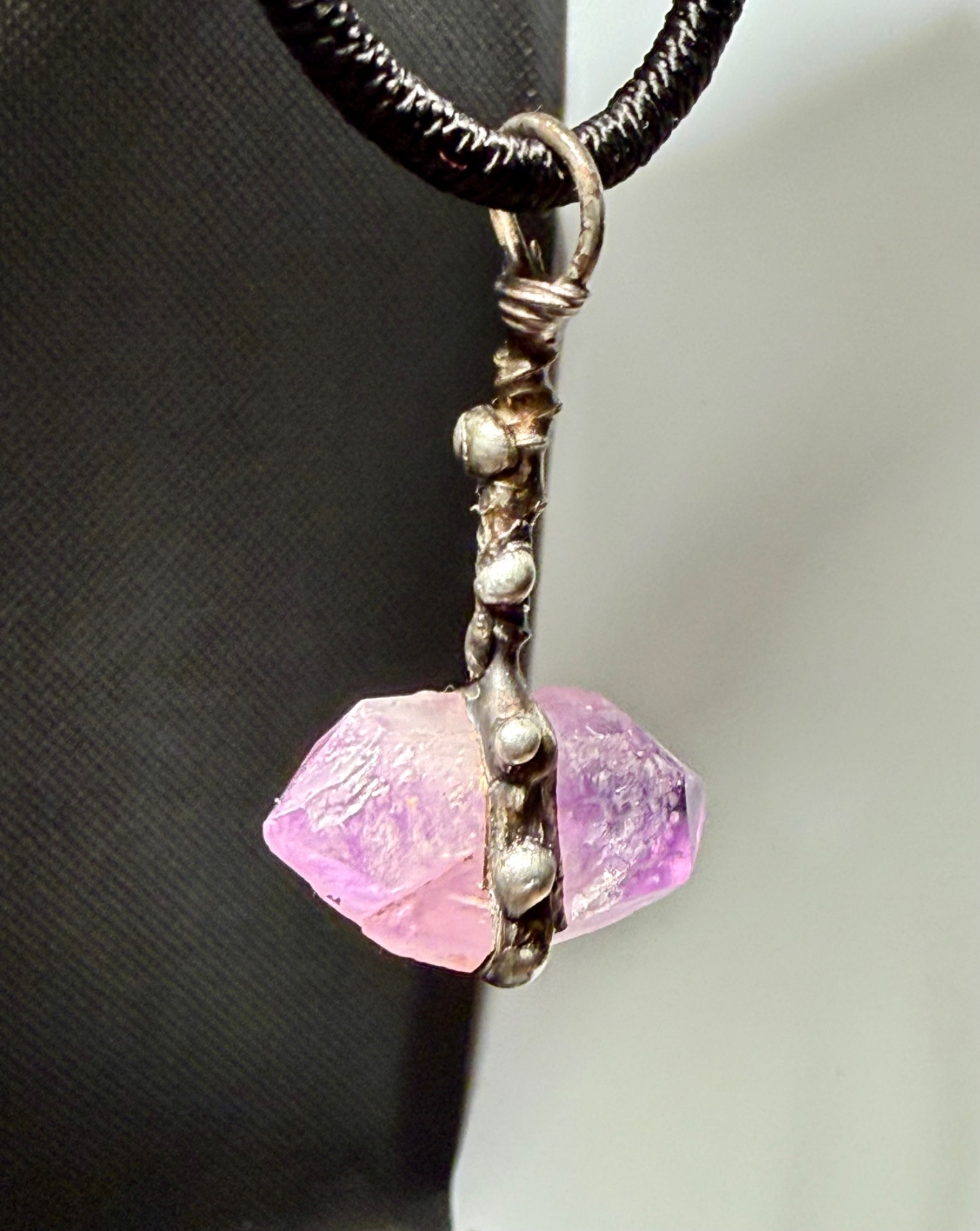 Tento amulet představuje dokonalou symbiózu přírodní geometrie a lidského řemesla. Centrálním kamenem je vzácný, přirozeně rostlý ametyst s oboustranným zakončením (tzv. ametystový herkimer), který je zasazen do detailně propracovaného lůžka vytvořeného technikou měkkého pájení – cínování.