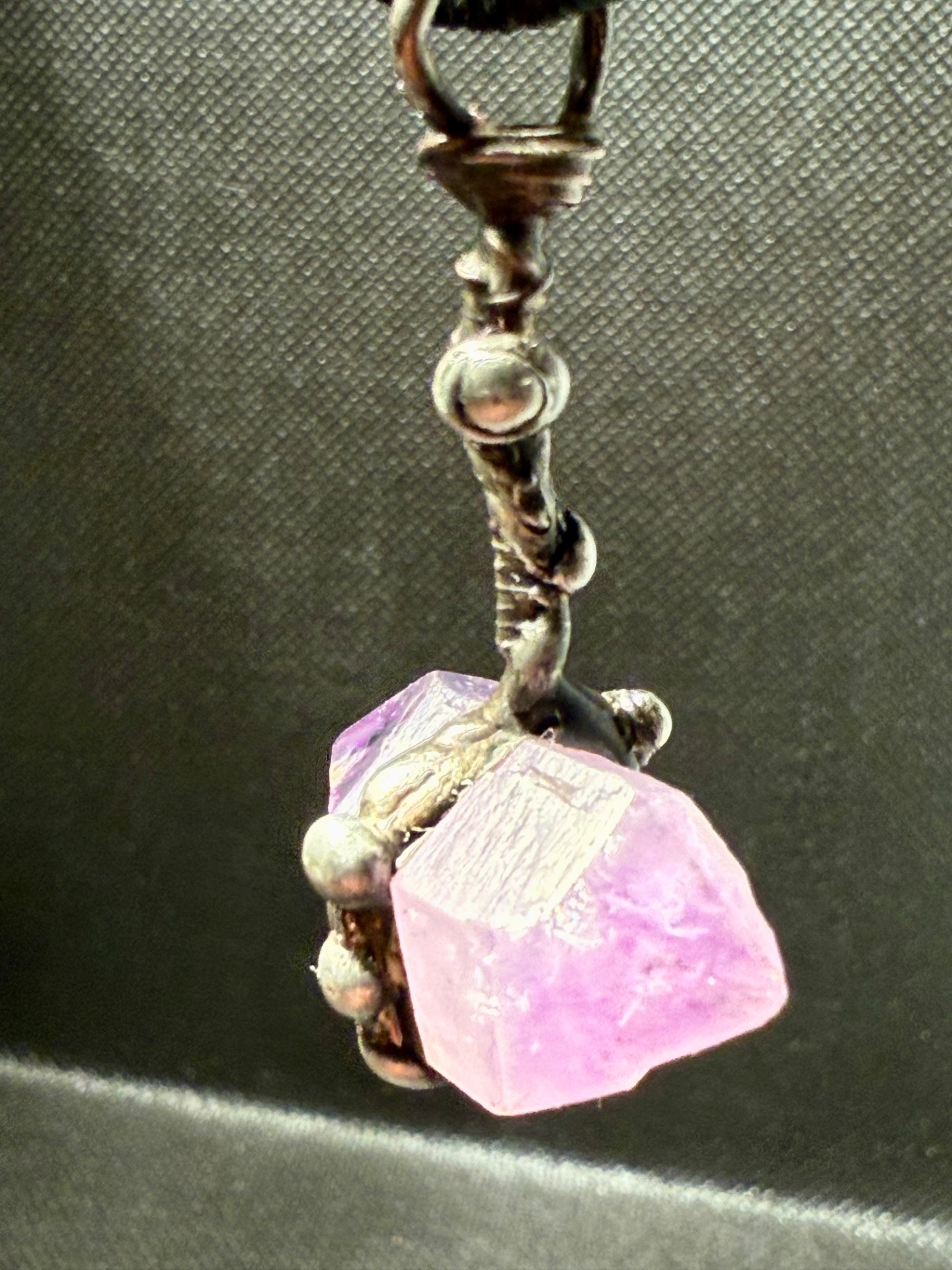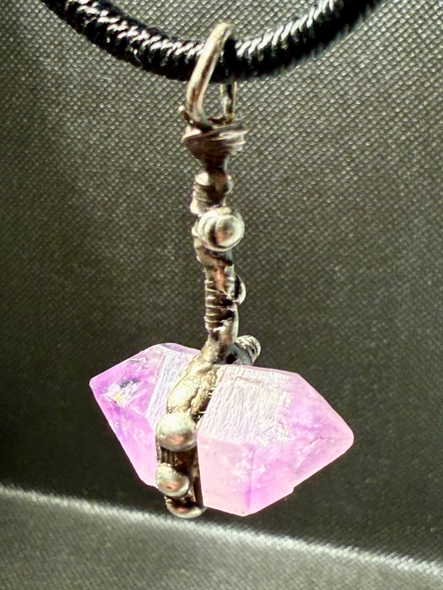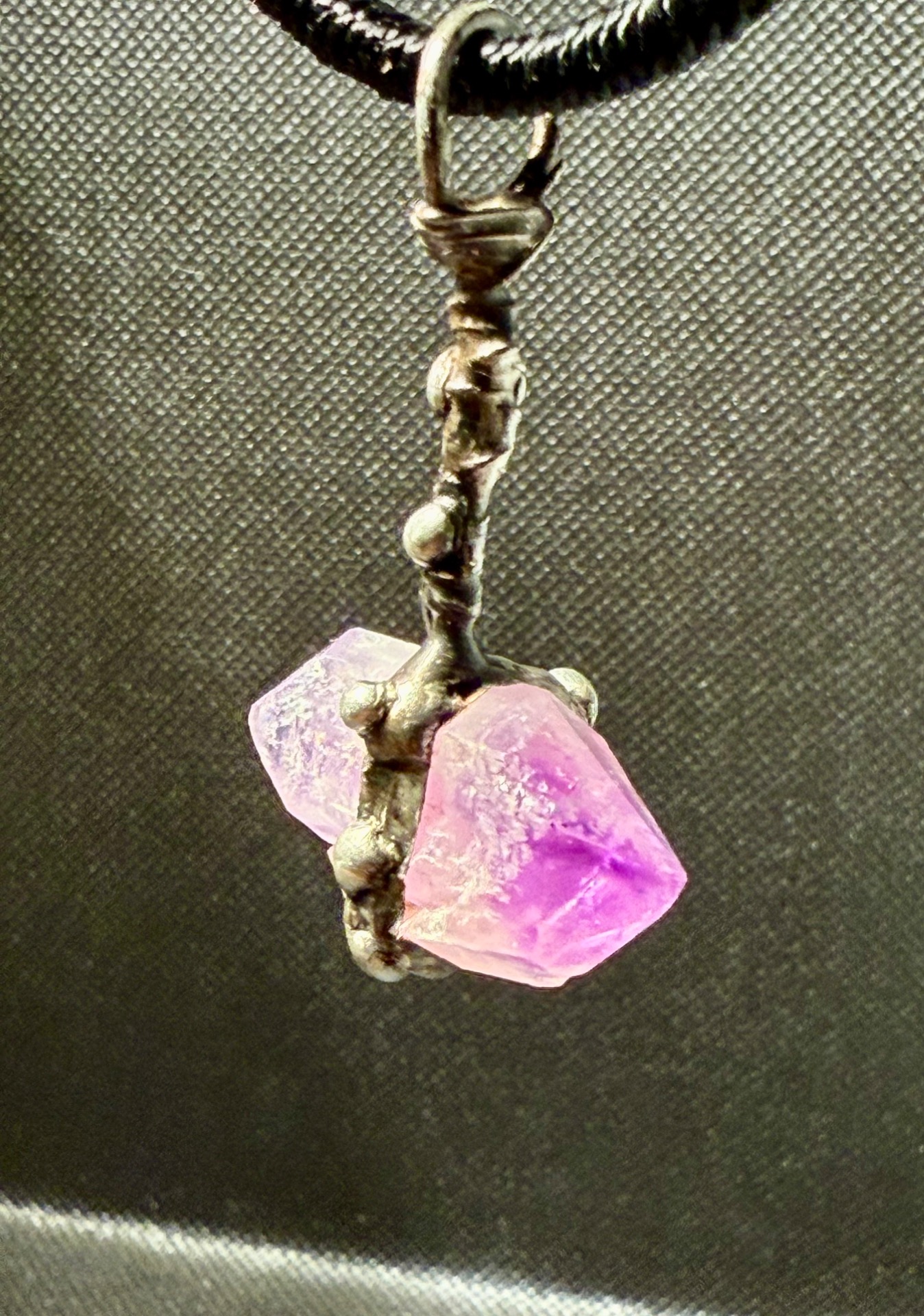 Tento amulet představuje dokonalou symbiózu přírodní geometrie a lidského řemesla. Centrálním kamenem je vzácný, přirozeně rostlý ametyst s oboustranným zakončením (tzv. ametystový herkimer), který je zasazen do detailně propracovaného lůžka vytvořeného technikou měkkého pájení – cínování.