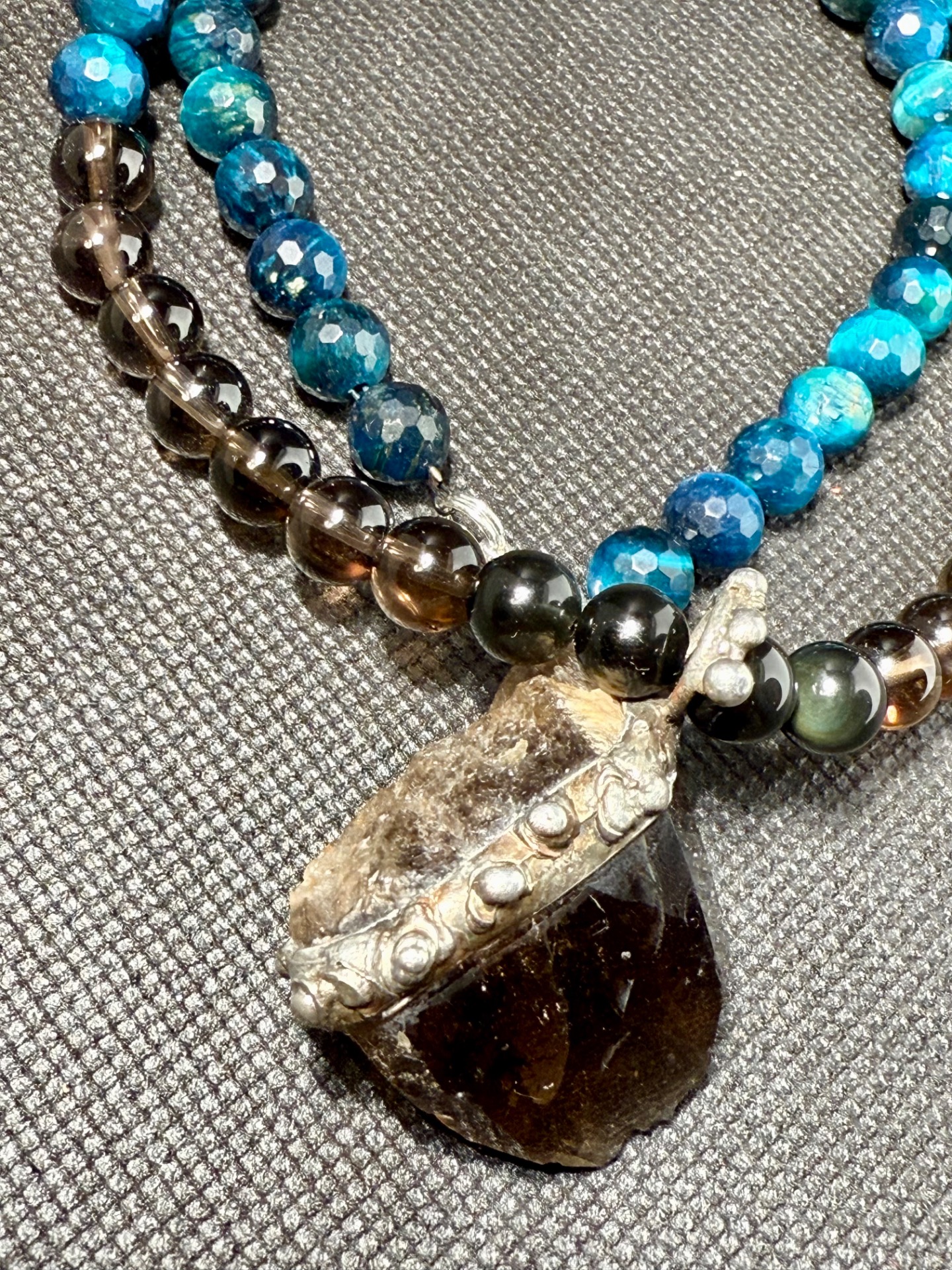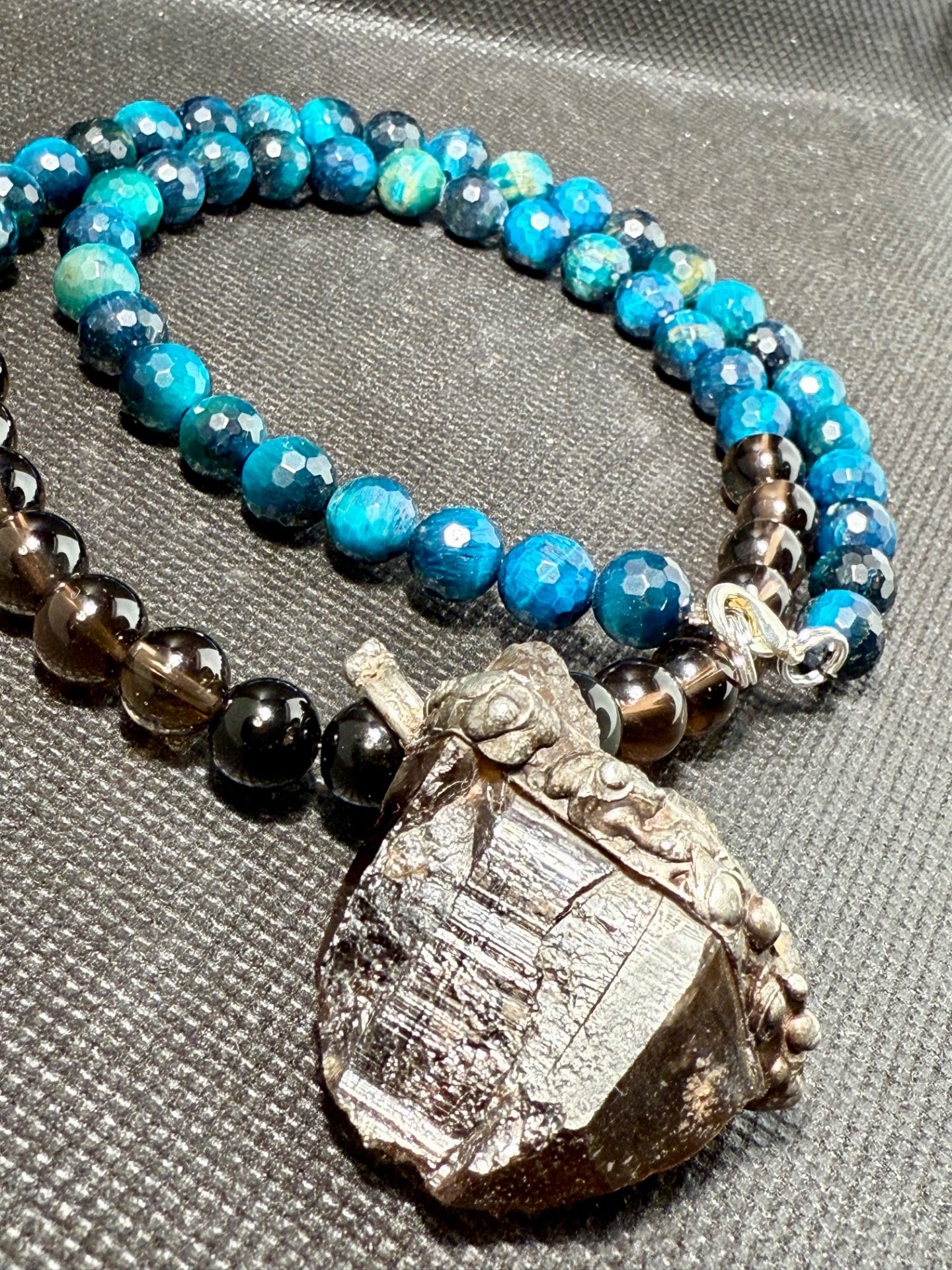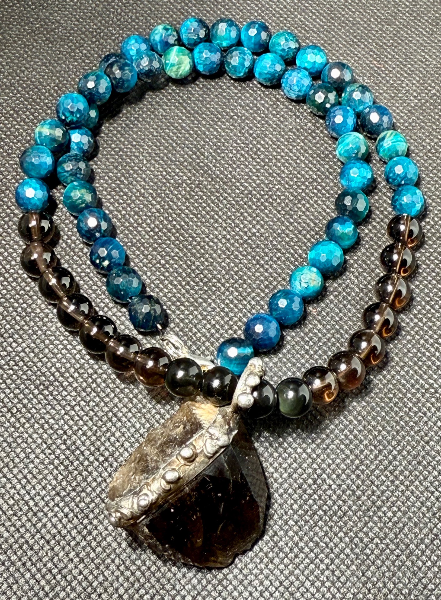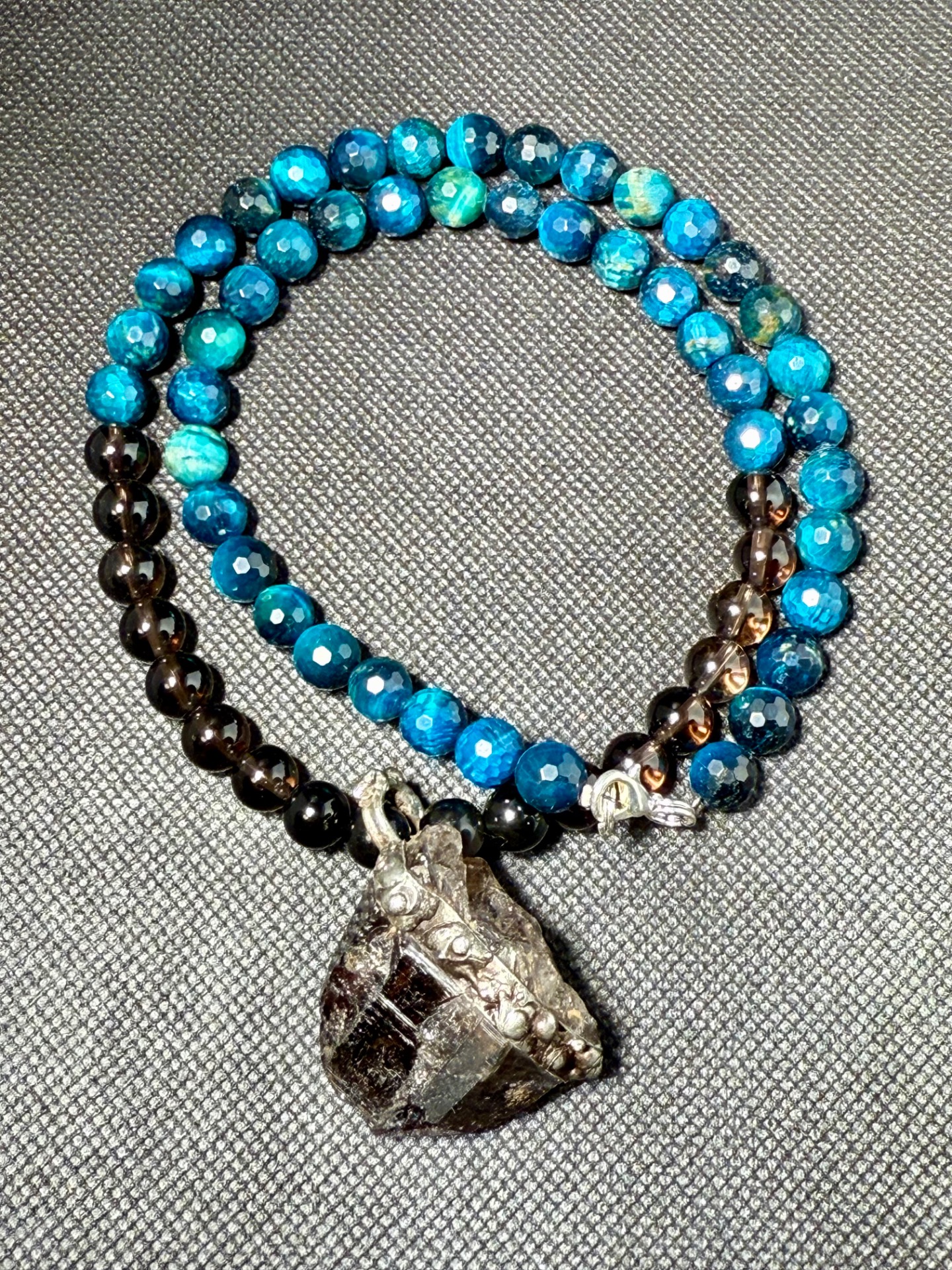 Tento originální náhrdelník v sobě spojuje drsnou krásu surové záhnědy nalezené na Vysočině a fascinující hru světla facetovaných kuliček modrého Tygřího oka a kuliček tromlované Záhnědy. Je to víc než jen šperk – je to osobní amulet pro ty, kteří hledají uzemnění, ochranu a jasnou mysl a pramen své energie.