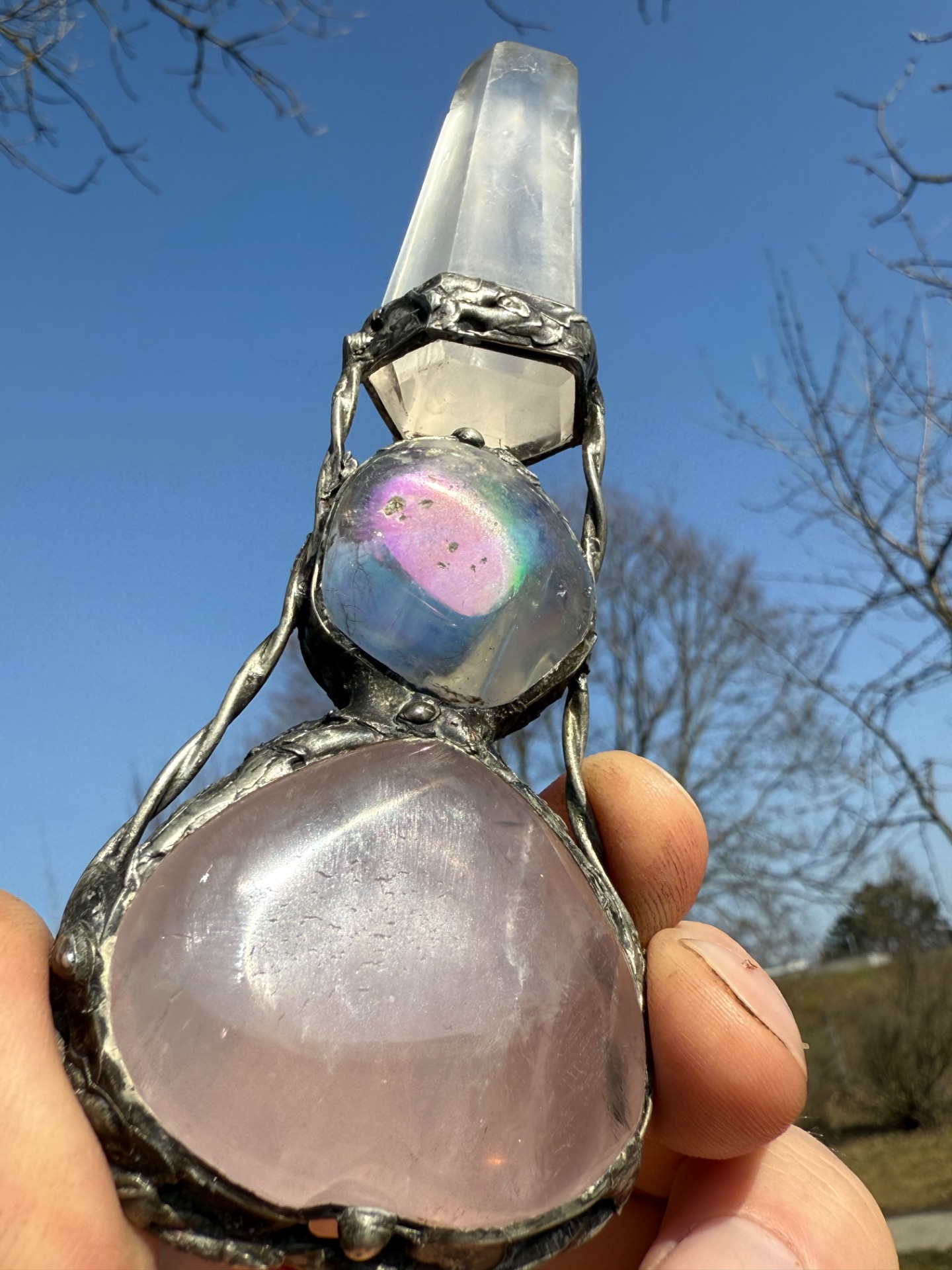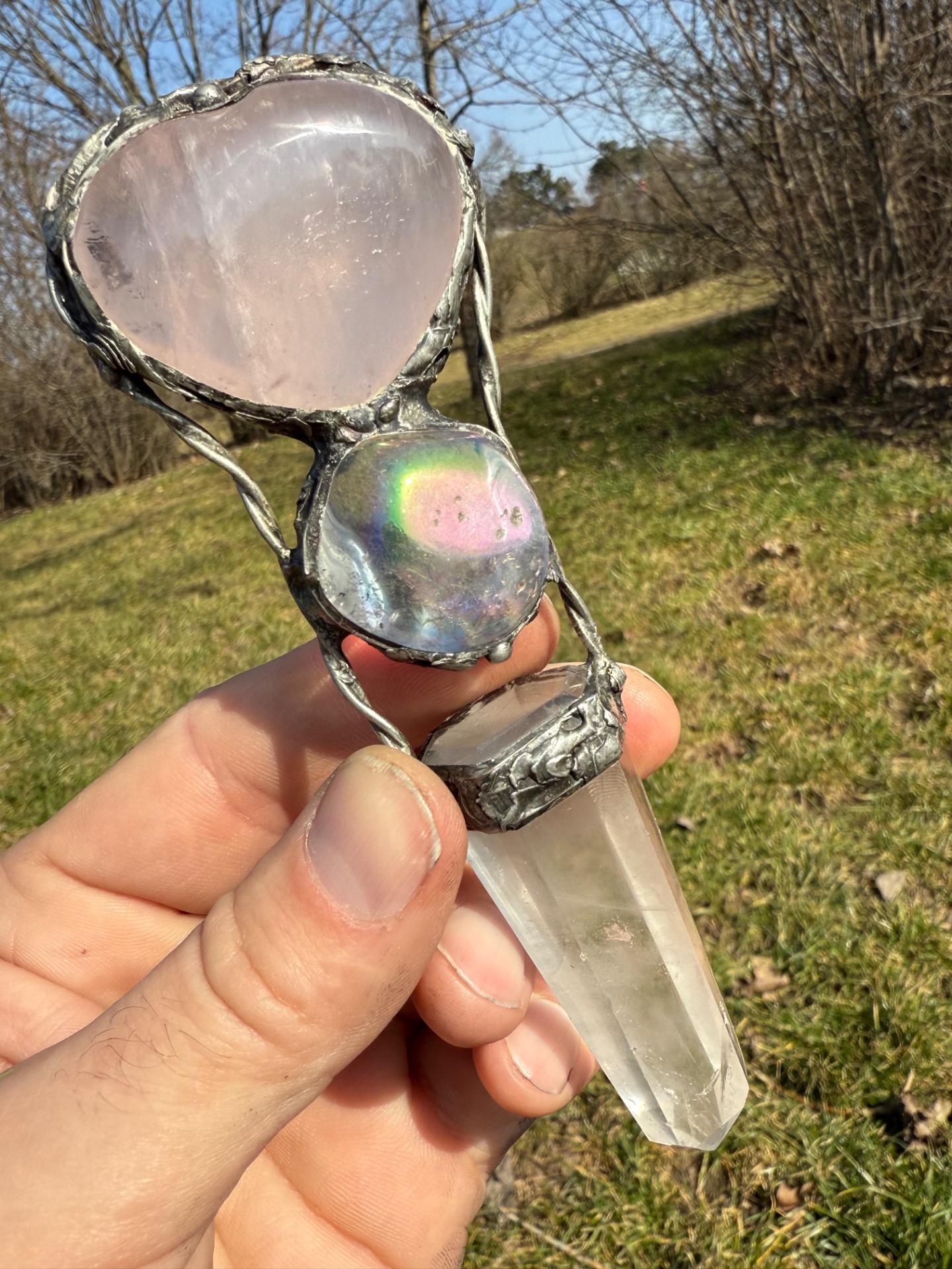 • Kameny: Růženín (srdce), Aqua aura křišťál, čirý křišťál (hrot).