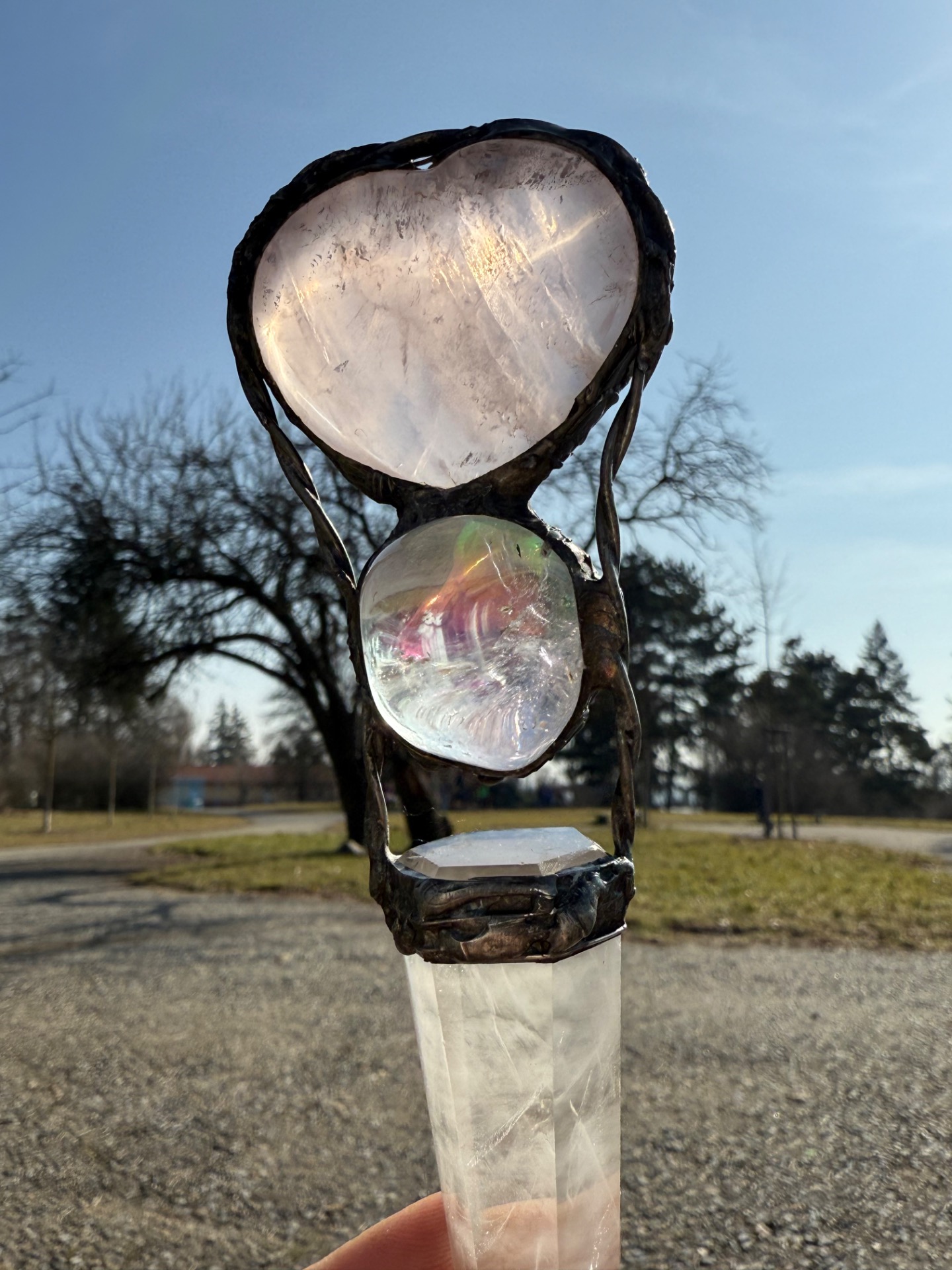 • Hrot: Křišťál čistoty – Hůl je zakončena hrotem z čirého křišťálu, který energii lásky koncentruje a vysílá do prostoru. Je to hrot, který prozařuje temné kouty duše světlem.
