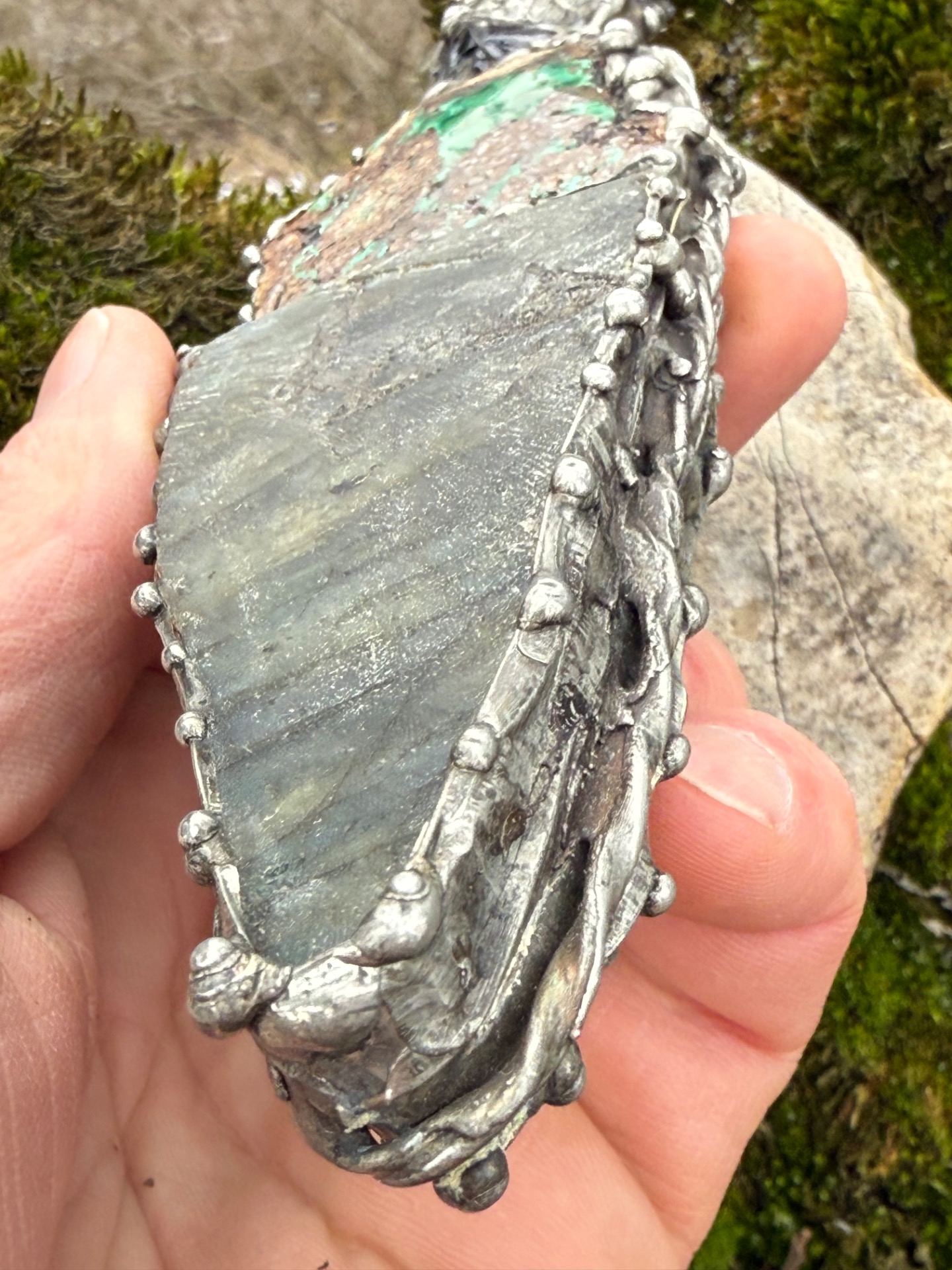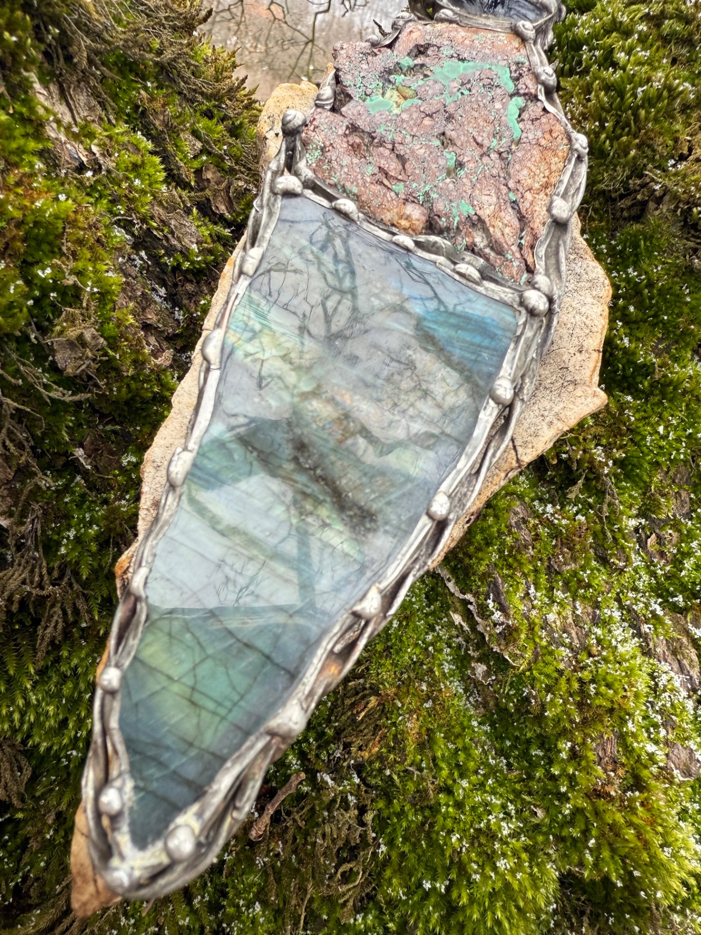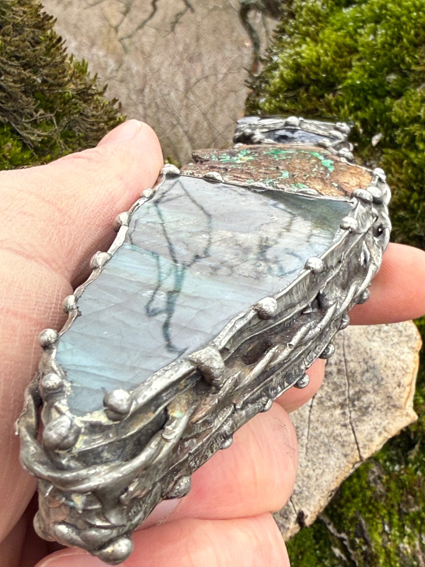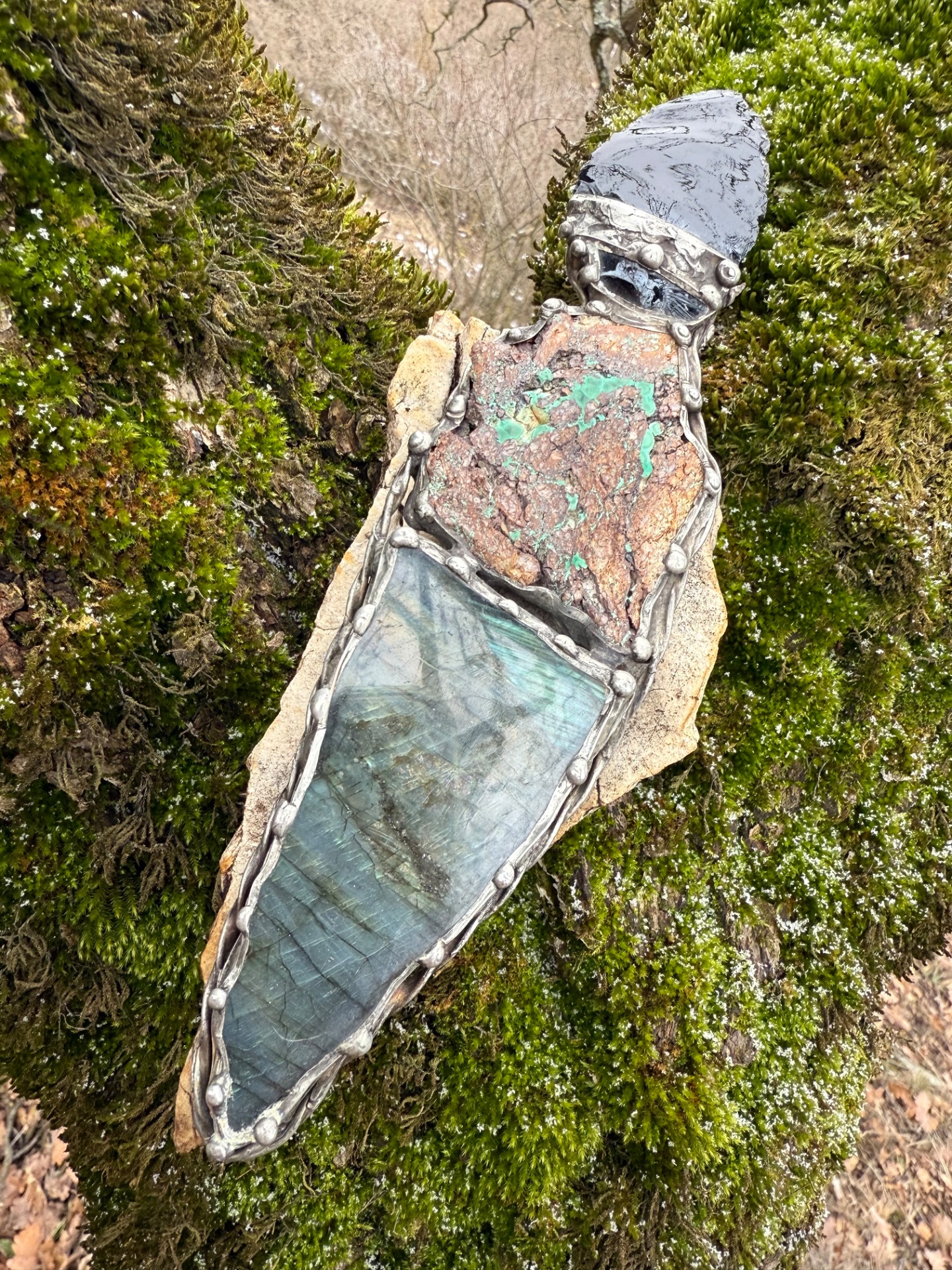 3. Rukojeť: Labradorit (Madagaskar) – Kámen mystiky a vnitřního světla. Rukojeť nabízí dvě tváře: leštěnou, která odhaluje hluboké vnitřní ohně (labradorizaci), a surovou, která nás vrací k podstatě země.