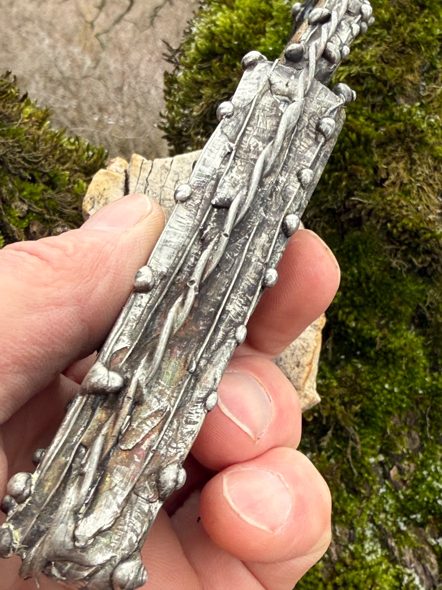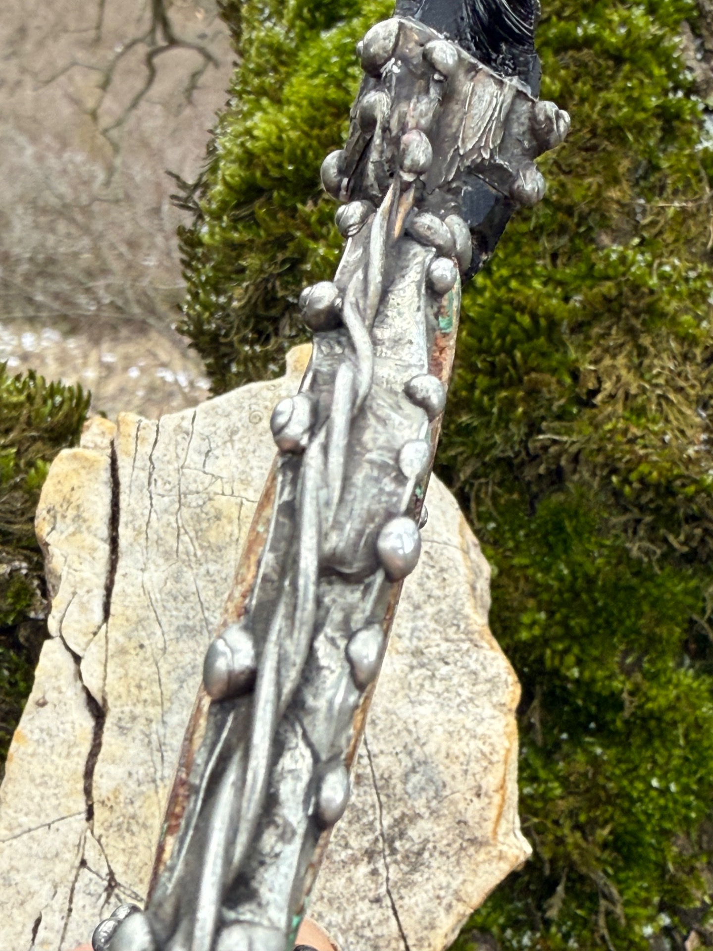 Tato rituální hůl, vytvořená autorskou technikou cínování, nese záměr "Šaman". Je projevem divoké přírody a moudrosti starých kultur. Její dýkovitý tvar není náhodný – v šamanském světě symbolizuje schopnost rozsekávat iluze, oddělovat nepodstatné a precizně směrovat záměr.