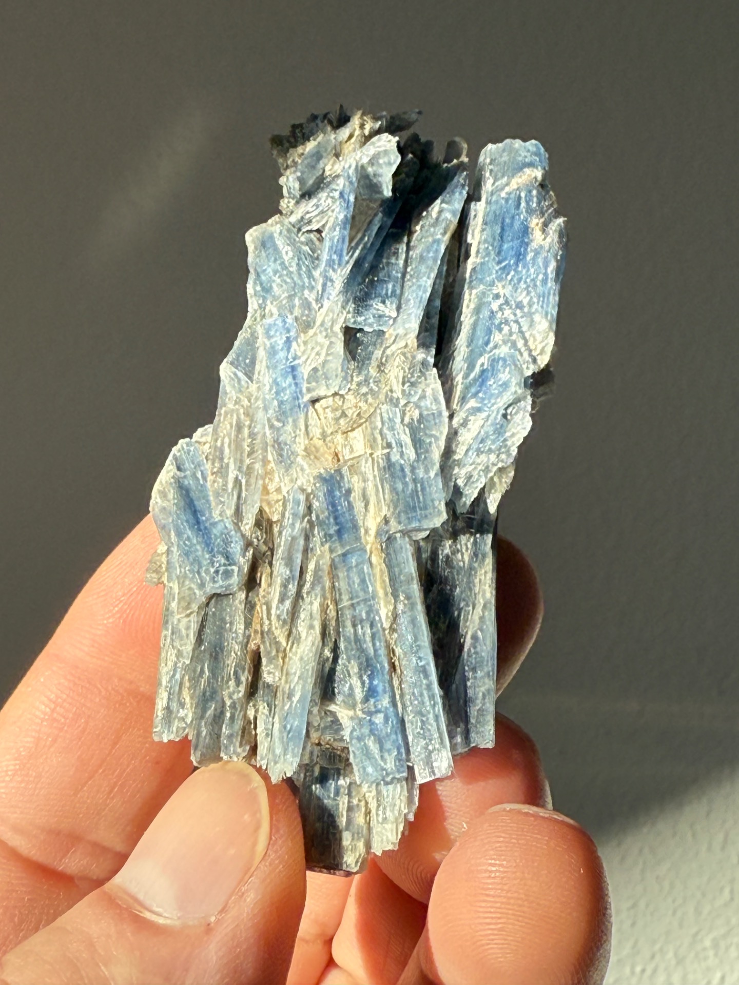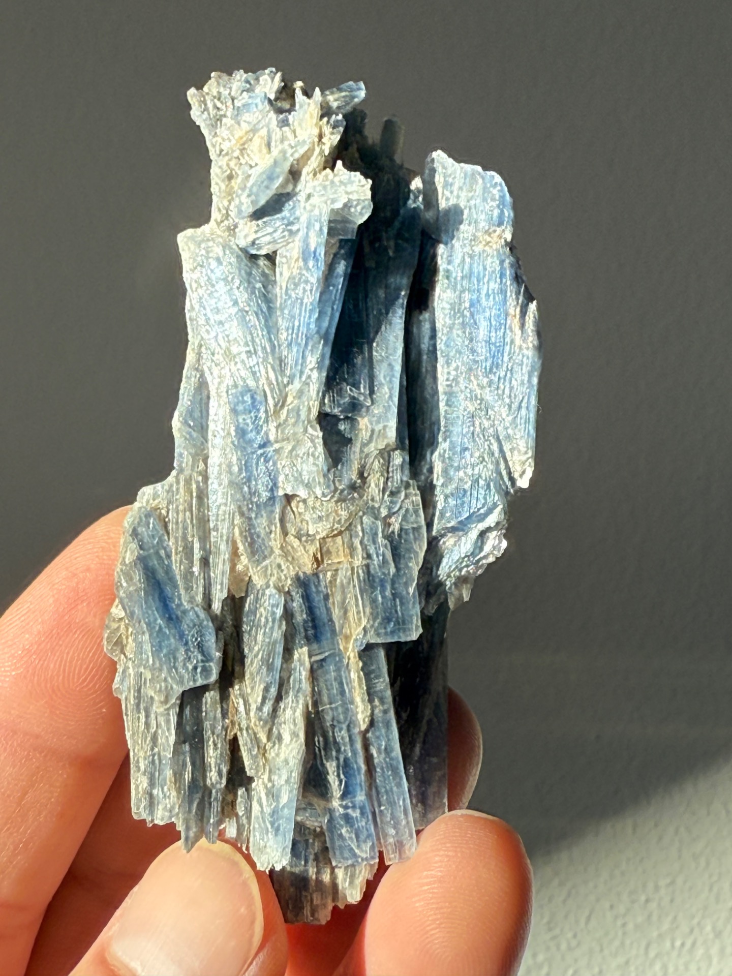 Tento vzorek přírodního Kyanitu, známého také pod názvem Disten, vyniká svou sytě modrou barvou a charakteristickým perleťovým leskem na svých podlouhlých krystalech. S vahou 94 g a štíhlým tvarem o délce 95 mm jde o velmi elegantní minerál, který v sobě nese energii klidné síly a nadhledu.