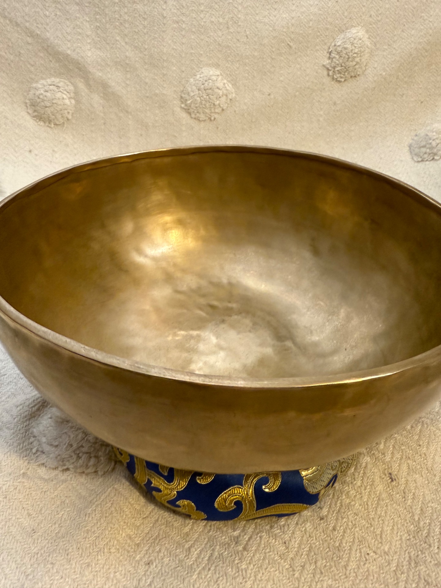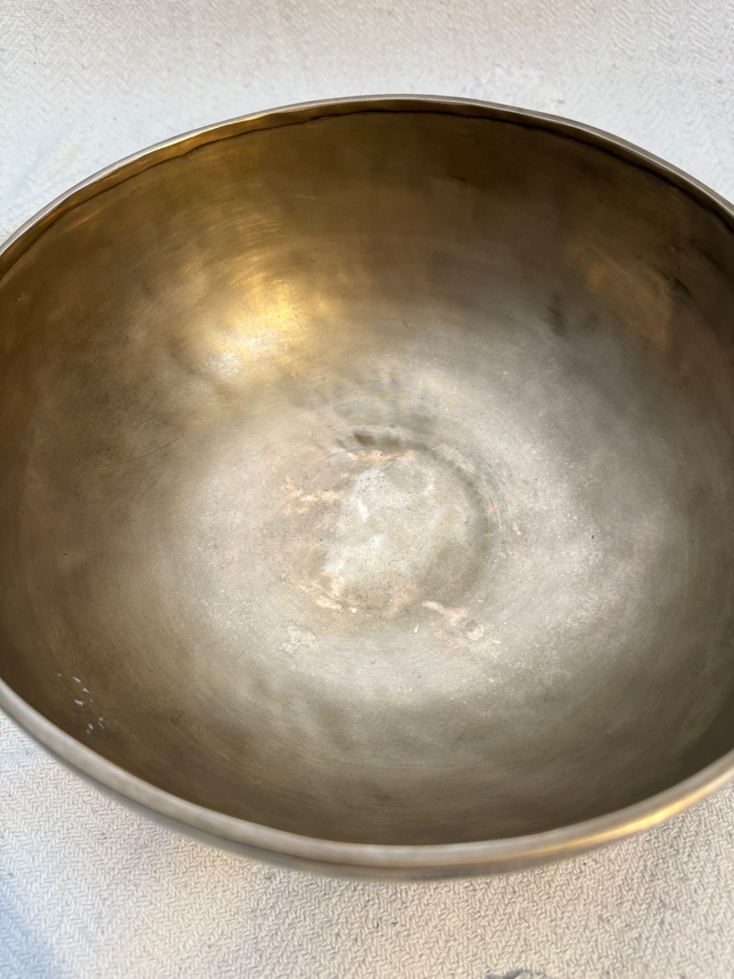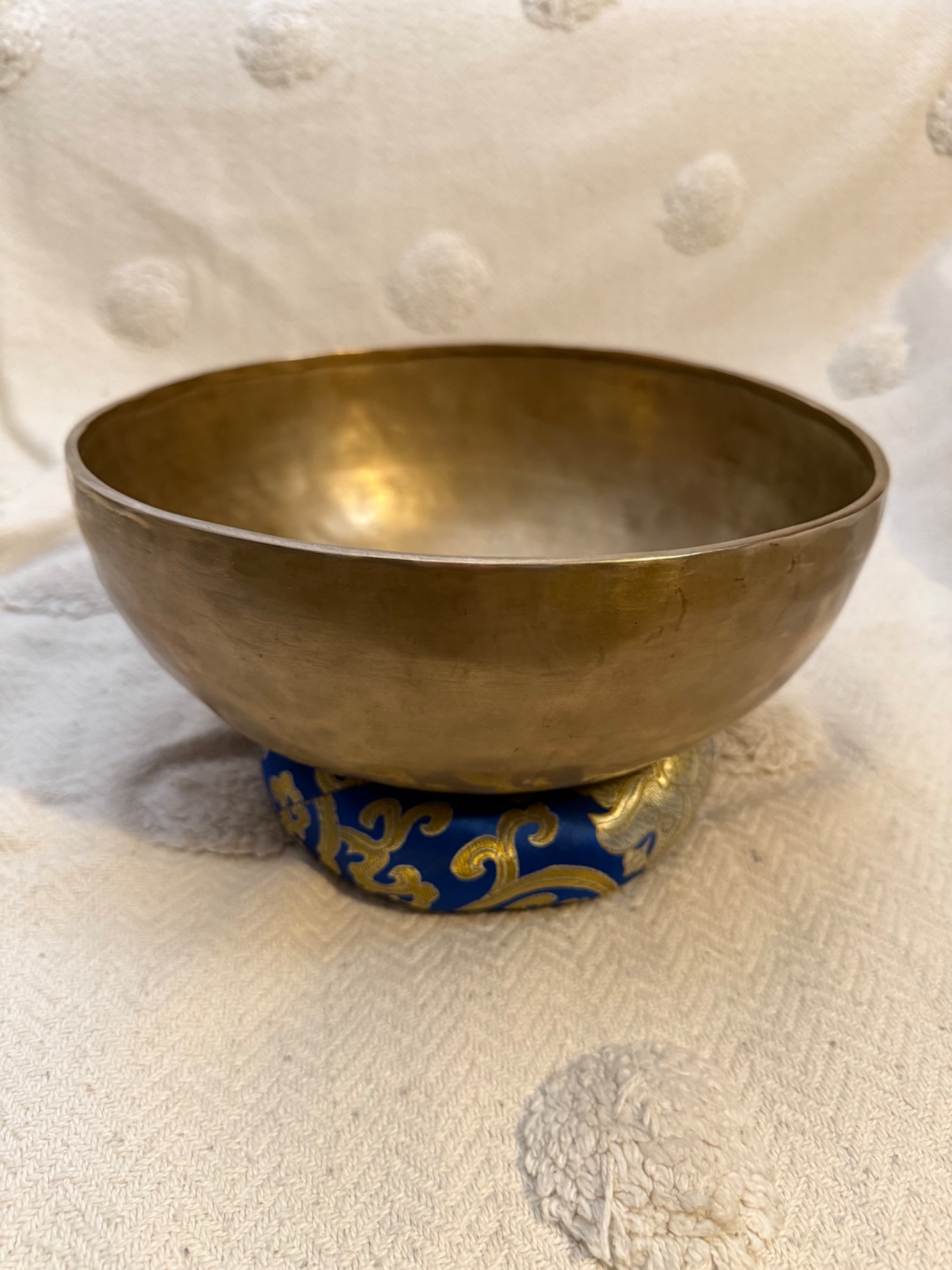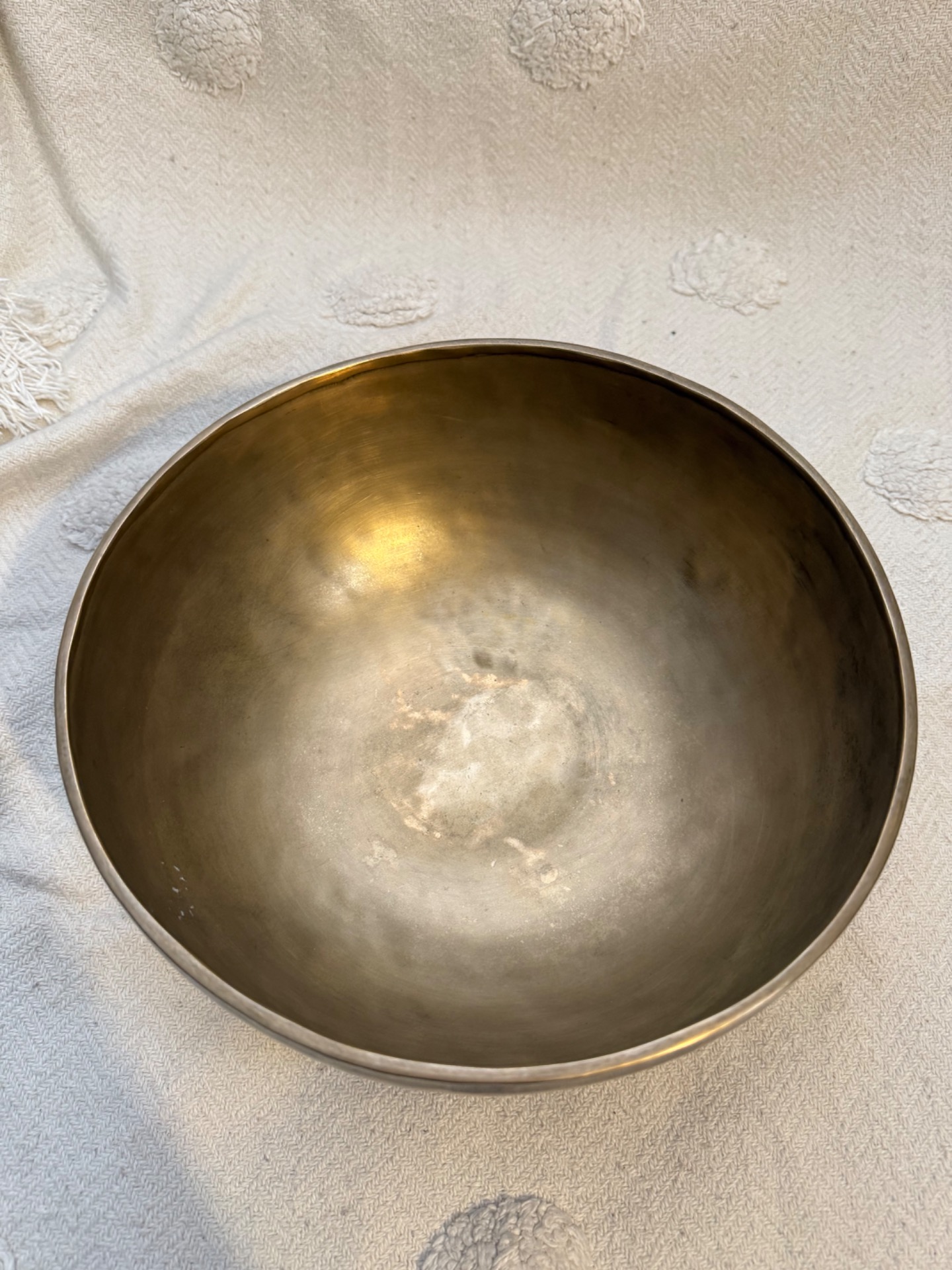 Tato ručně tepaná tibetská mísa z Nepálu je důkazem, že to nejdůležitější se skrývá uvnitř. Se svým zlatým matným povrchem působí velmi moderně a čistě, ale její zvukový projev je naprosto unikátní. Díky preciznímu vytepání do tloušťky, která nahrává bohatým vibracím, nabízí tato mísa vzácnou kombinaci hlubokého základu a jasných, vysokých tónů.