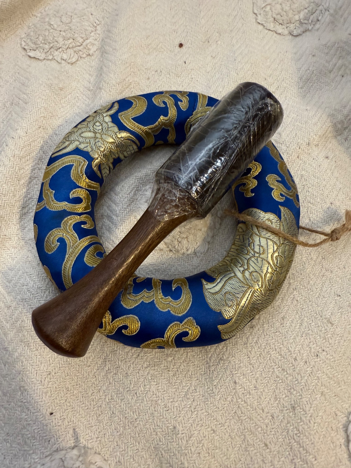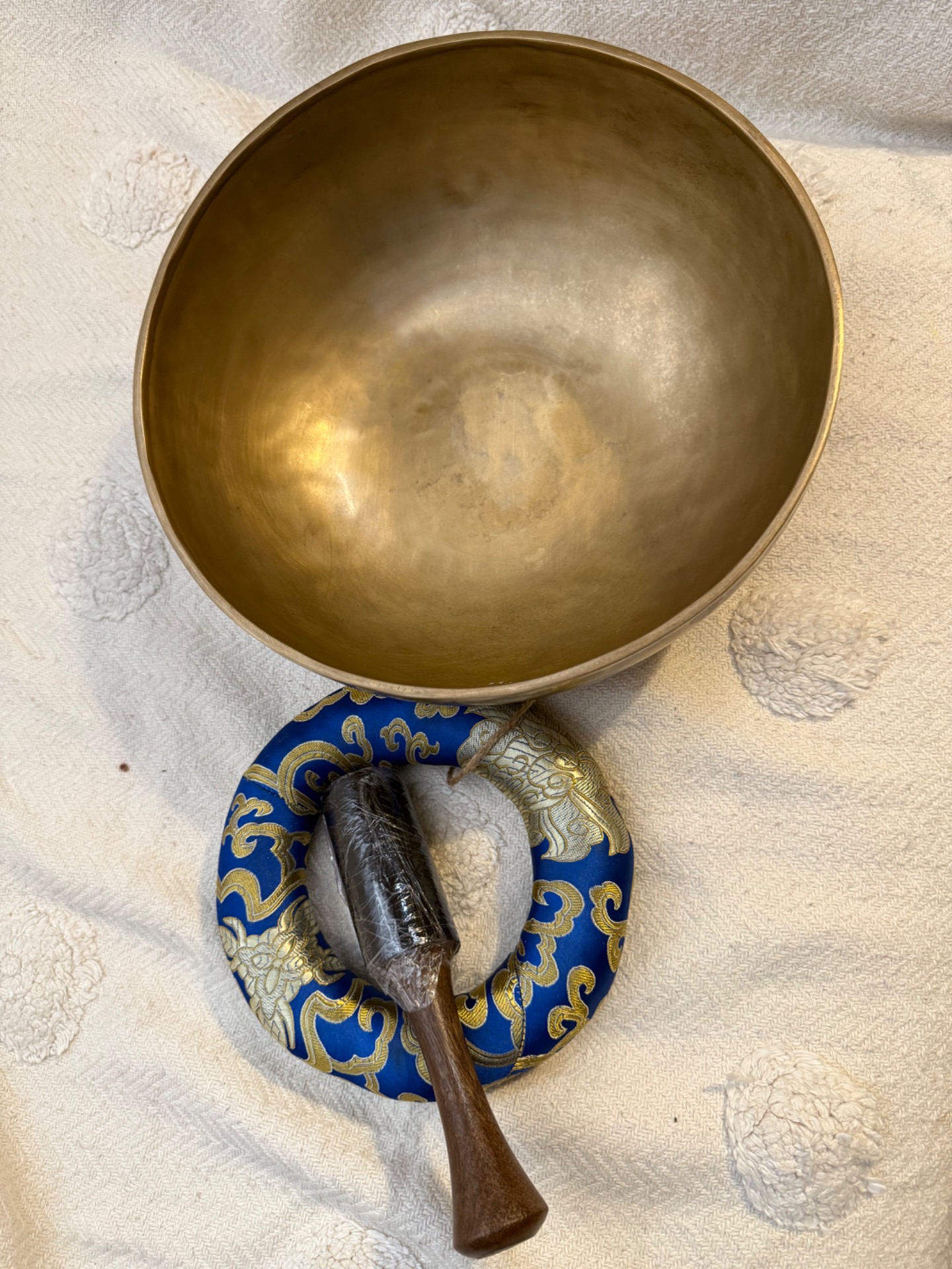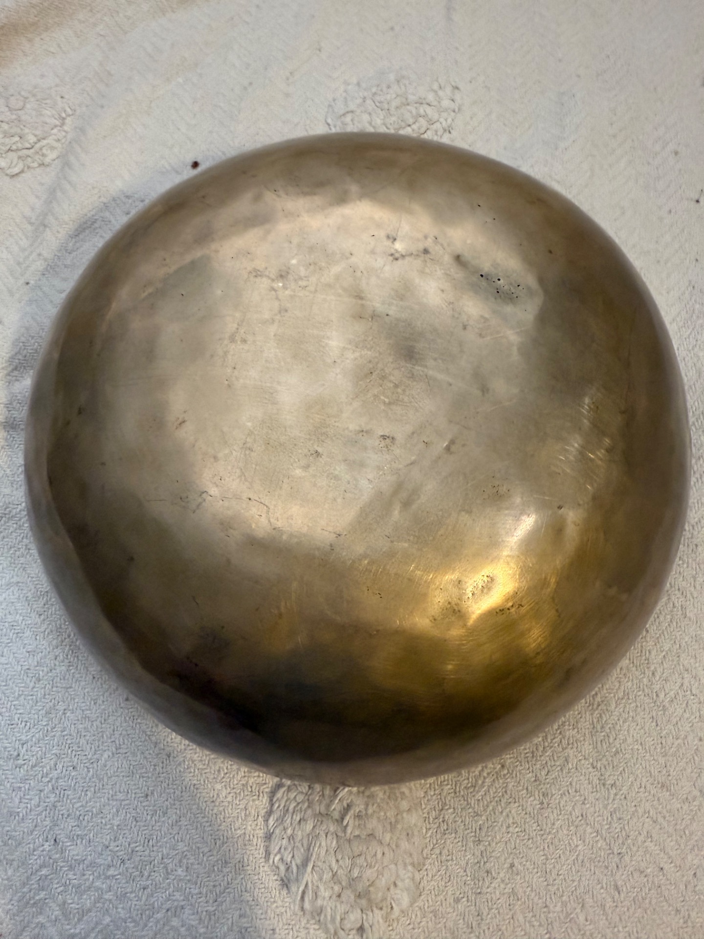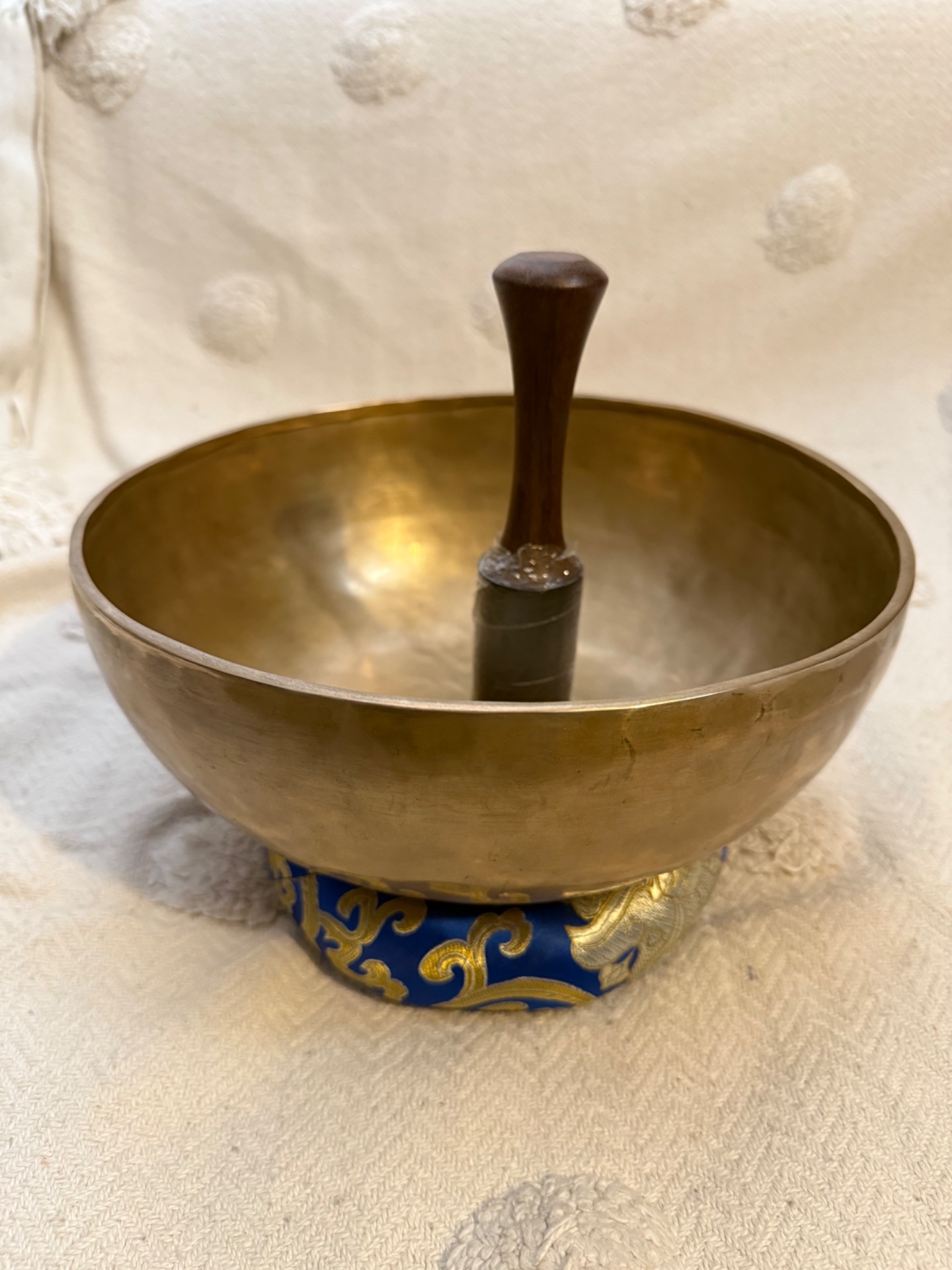 Tato ručně tepaná tibetská mísa z Nepálu je důkazem, že to nejdůležitější se skrývá uvnitř. Se svým zlatým matným povrchem působí velmi moderně a čistě, ale její zvukový projev je naprosto unikátní. Díky preciznímu vytepání do tloušťky, která nahrává bohatým vibracím, nabízí tato mísa vzácnou kombinaci hlubokého základu a jasných, vysokých tónů.